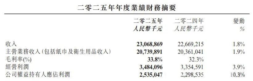 纸巾业务仍是增长主力,营收同比上升5.6%至141.7亿元,贡献了超六成收入。